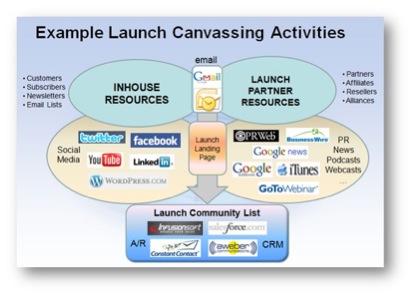 Twitter is a social networking tool that’s great at getting the word out about your launch and for attracting prospects to join and promote your launch. However, Twitter is just one element of a proper launch strategy, as shown in the launch canvassing big picture here: